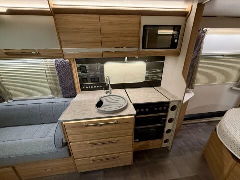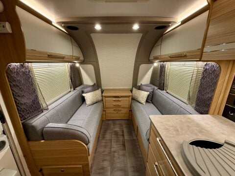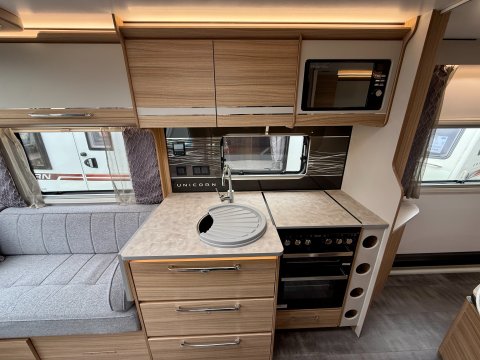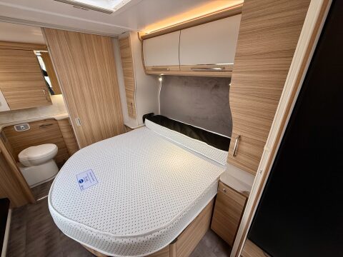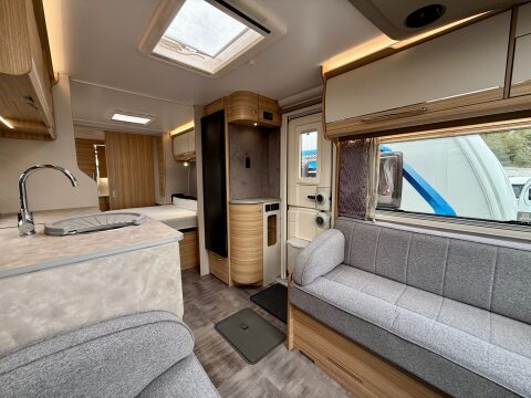 Specification: End washroom, fixed bed, fridge, microwave, oven, mains electric, water heater, cassette toilet, shower, blinds, fly screens, door flyscreen, loose-fit carpets, stereo, Heki rooflight, battery charger, solar panel, alloy wheels, spare wheel, TV directional aerial, GRP sides, hitch stabiliser, sunroof, motor mover, external 230 V, Alde wet central heating. CRiS registered. 12-month warranty. Part-exchange welcome. Finance available (written quotes on request).