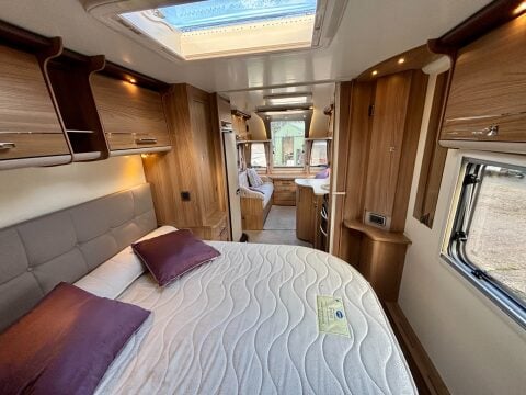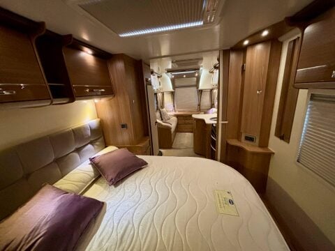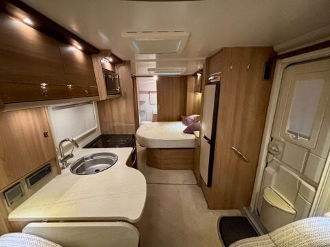 Specification: Fixed Bed, Fridge, Microwave, Oven, Mains electric, Water heater, Cassette toilet, Shower, Blinds, Fly screens, Door flyscreen, Loose fit carpets, Stereo system, Heki rooflight, Battery charger, Solar panel, Alloy wheels, Spare wheel, TV Directional Aerial, GRP side panels, Hitch head stabiliser, Sun roof, Motor mover, External 230v, 6 month warranty, Part exchange welcome, Finance available subject to status written quotations available on request, CRiS registered, Alde wet central heating. Loose fit carpets included.