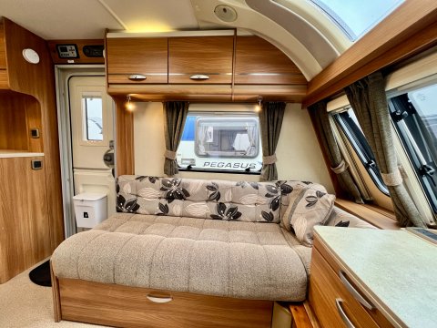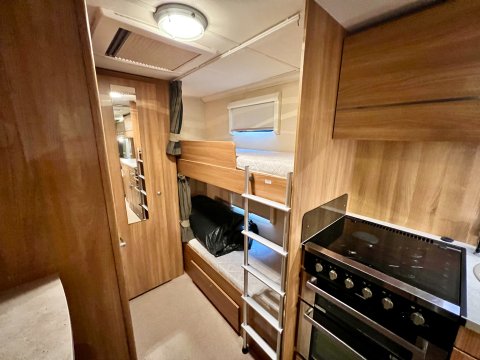 Specification: End Bedroom, Fixed Bunk beds, Fixed Bunk beds, Fridge, Microwave, Oven, Mains electric, Water heater, Cassette toilet, Shower, Blinds, Fly screens, Door flyscreen, Loose fit carpets, Stereo system, Heki rooflight, Anti theft tracker, Battery charger, Alloy wheels, Spare wheel, TV Directional Aerial, One piece Aluminum side panel, Hitch head stabiliser, Sun roof, External 230v, 6 month warranty, Finance available subject to status written quotations available on request, CRiS registered. Loose fit carpets included.